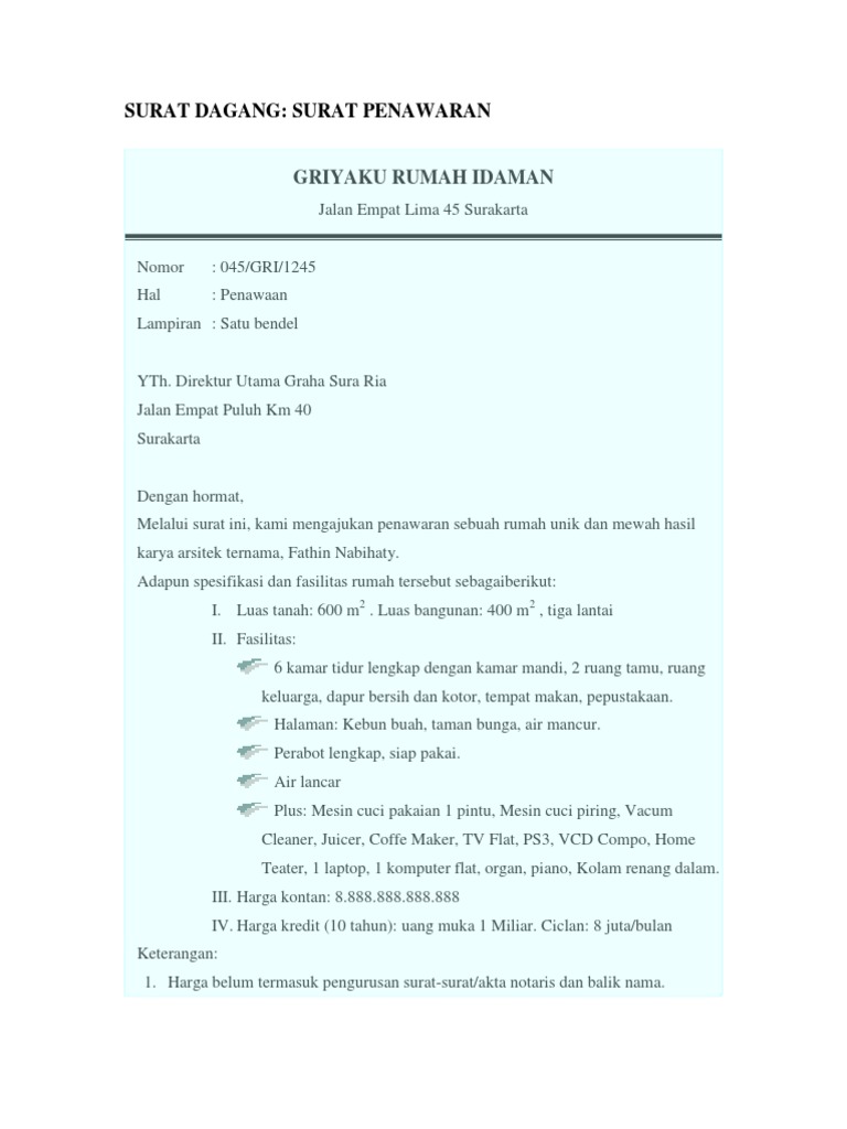 Contoh surat penawaran merupakan salah satu dari surat resmi yang sangat penting bagi seorang pengusaha, pedagang, jasa dan barang. Jika iya, sekarang anda membaca artikel yang tepat. Surat penawaran merupakan suatu surat yang ditujukan kepada suatu instansi yang bertujuan untuk menawarkan sesuatu. Surat penawaran harga adalah salah satu jenis surat yang dikenal dalam dunia bisnis. Harga, harga yang perlu dicantumkan di dalam surat penawaran produk bukan sebatas berapa harga produk yang ditawarkan.